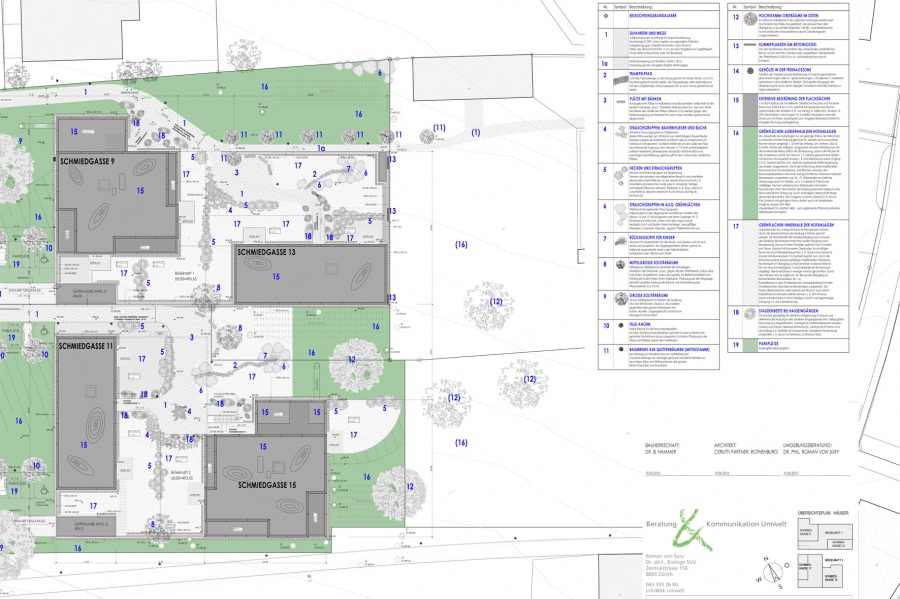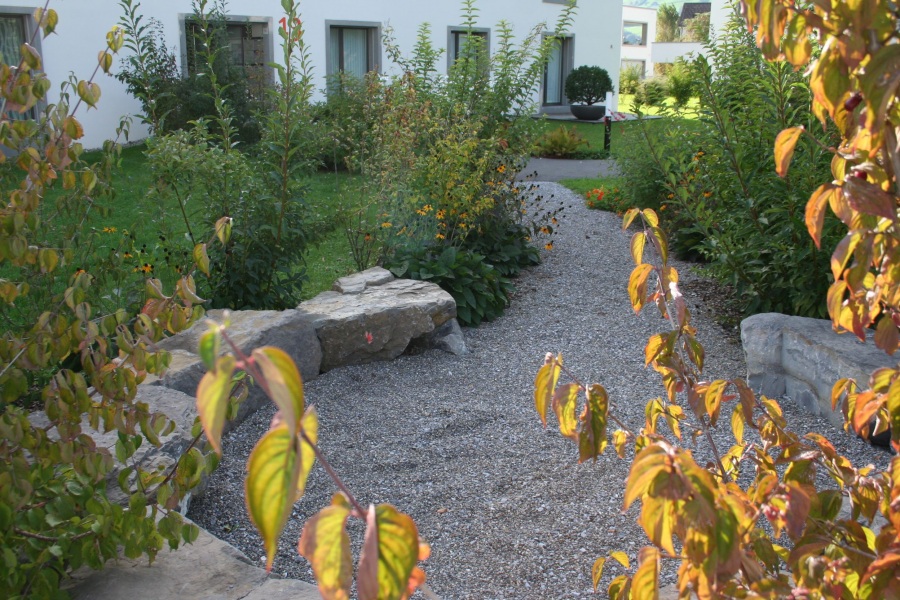In enger Tuchfühlung mit dem Architekten und der Bauherrschaft schufen wir ein spannendes Konzept für die Aussenraumgestaltung: Freiflächen, Bäume und Sträucher, Erschliessungswege, Ruheplätze mit entsprechenden Einrichtungen. In diesem Fall war es besonders wichtig, neben dem eigenen Grundsatz der «Naturnähe» auch die ästhetischen Vorgaben des Gestaltungsplans zu berücksichtigen, die sich aus der exponierten Lage nahe des historischen Dorfkerns ergaben.